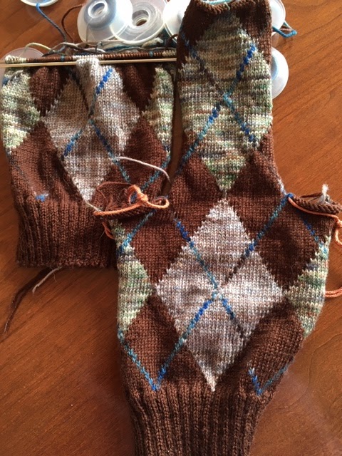 Kelly’s Argyle adventure continues. The socks are roughly based on the pattern Men’s Argyle socks #5710. She’s not really using pattern that much, but she used it to create a Stitch Fiddle chart for the colorwork.
