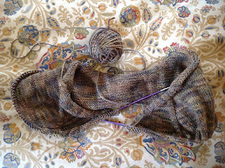 She cast on a pair of her standard socks using destash Austermann Step yarn from the NoCKRs retreat. She also cast on Cloud Cover, an open front cardigan by Heidi Kirrmaier.