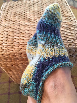 She is getting “back on the horse” by knitting a pair of “vanilla” socks with Austerman Step with heels and toes in Knit Picks Stroll. Both are spirit yarns from the NoCKRs detash room.