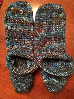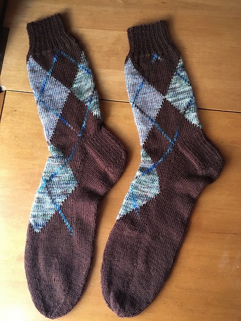 She also finished a second pair of Jo’s Perfect Slipper Socks. They are in one of the Western Sky Knits merino cashmere sport weight skeins that she has used for criss-cross colors in argyle socks. This is a perfect gift knit!