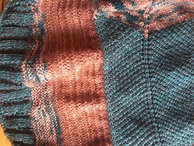 Marsha continues to work on Cloud Cover by Heidi Kirrmaier. It has an unusual construction. Knit yoke, then sleeves, then body, then collar. Marsha is hoping she doesn’t run out of yarn before that big shawl collar is done.