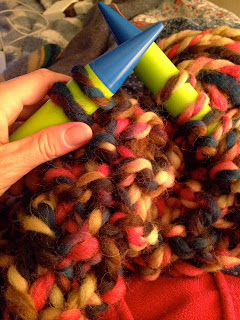 Kelly's ongoing projects have been languishing due to grading exams, moving the chicks, and starting the bees. However, there was the urge to start a project that couldn't be denied! First a super-quick cowl with size 50 needles! No pattern, just moss stitch until the yarn ran out.