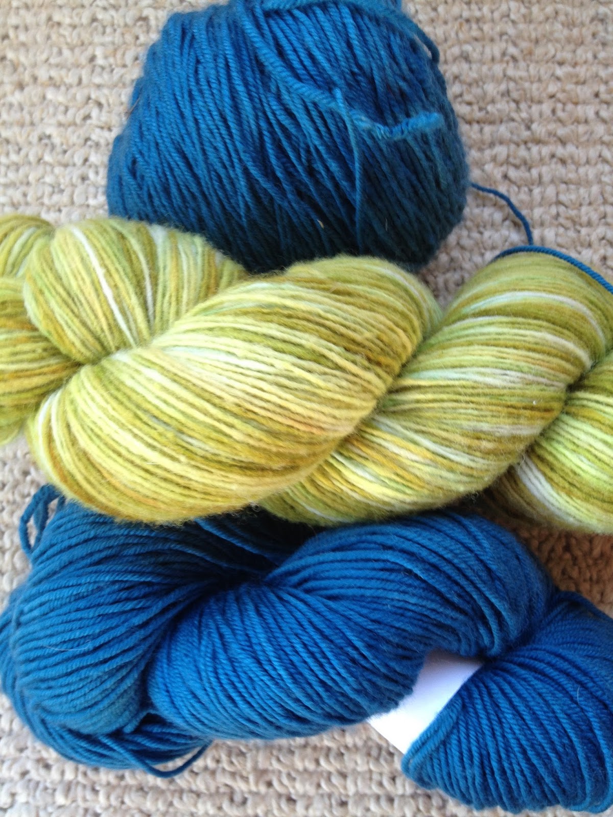 Kelly has also started a Color Affection that she is calling A Bigger Affection since she is modifying it (of course!) to use DK yarn and be as big as possible to use up some very old stash. The peacock blue and the acid green have been waiting in stash to be used together for about 5 years!