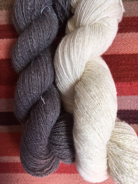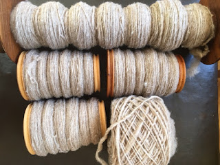 Kelly has been doing a lot of spinning with two different wool/angora blends. One is a dyed gray and the other is a natural white. She also continues working on the CVM fleece with both a fingering/sport 3-ply and a bulky singles yarns on the wheels.