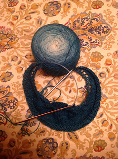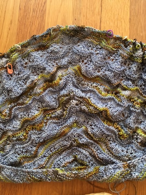 The only other knitting has been on the NoCKRs shawl. The desire to use as much yarn as possible of both colors has led to some pattern modification experiments.