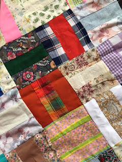 Kelly has started working on her long-term project, too. It is a quilt top that she started while in high school. Since the last episode she has made progress on this quilt, which she is planning to use as a queen-sized bedspread. It is a hand pieced quilt in the "Split Rail" design and is made from sewing project scraps from her childhood and teen years. The "squares" are not very square!