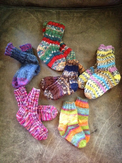 The first socks she ever made in a sock class are the bottom socks in the photo. The orange socks, second from the top, are her most recent socks. The very top socks are Turkish Bed Socks by Churchmouse Yarns.
