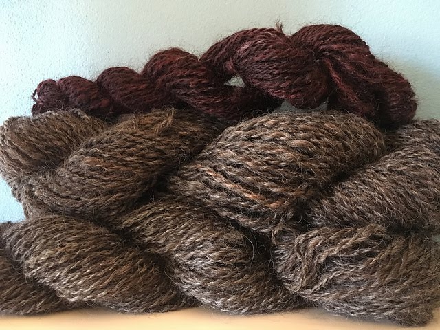 Kelly's Great Poncho Adventure is moving along after a mistake in the colorwork meant she had to rip back about 4 inches of work. It was painful, but worth the effort. She has adapted the Om Shawl to three colors and is working this out of three different gray yarns from Neighborhood Fiber Co.Kelly has also been spinning. She finished plying two skeins of the endless 3-ply CVM.