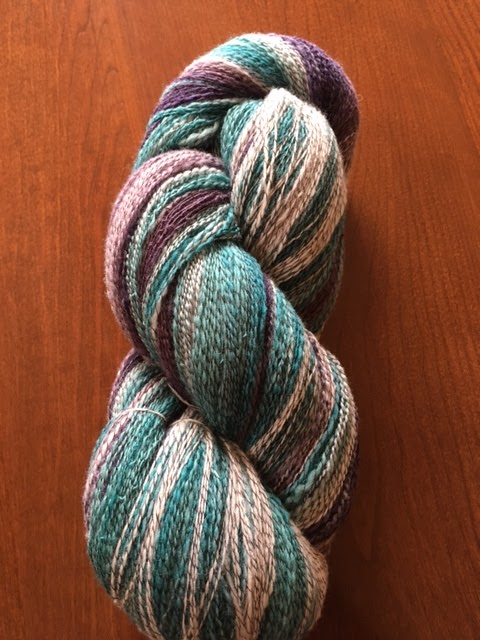Kelly has also committed to spinning every day, along with a few other spinning related goals. Her Tour de Fleece 2017 page has a list of the goals and photos of the spinning projects. The first finished spinning of the tour is the Loop Bump that she plied with silk thread from the Black Sheep Gathering.