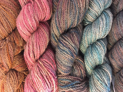 There are two white yarns that are available in hand-dyed skeins, a soft, fluffy, and textured rambouillet is available in a worsted weight. A more rare variety, a Border Leicester/Corriedale cross, is available in about a sport weight.
