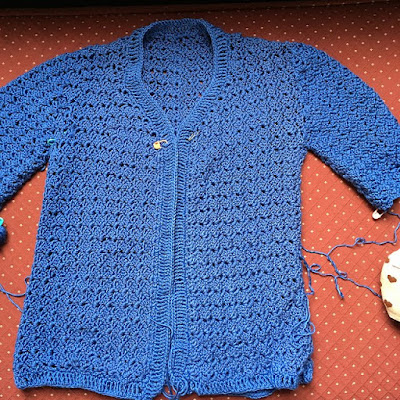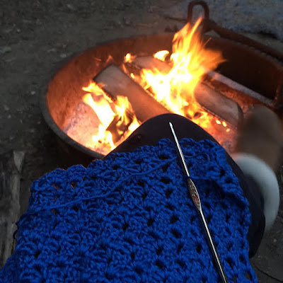 Kelly's camping trip knitting was the blue crochet cardigan that she stalled out on some time ago.