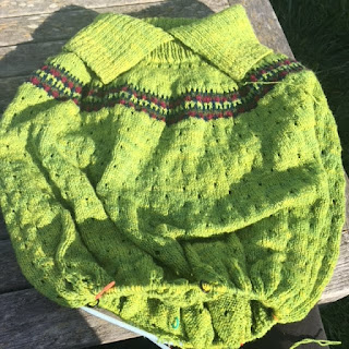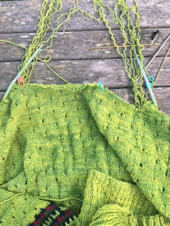 Since the poncho had a mistake that needed to be repaired in a quiet time period, Kelly pulled the linen Summer Fjord top back out and put about an inch on it. It has a few inches to go before the bottom ribbing and will be finished in time for warmer weather.