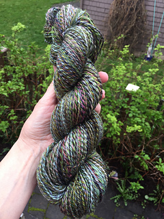 Marsha's has completed three skeins of her Combo Spin #3. Kelly and Marsha have a discussion on the math required to determine the final percentages of fiber in the finished yarn from the various fibers that were used.