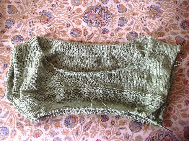 She knit it using Neighborhood Fiber Company yarn that she got at Stitches West in February. She made some sleeve modifications that are detailed in her project page.
