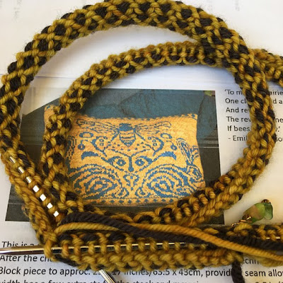 All the staying at home has led Kelly to use lots of yardage already this summer. She finished many yards of plying, spun a braid of fiber into a nice 3-ply skein, has a blanket weaving project on the loom, and has started her colorwork bee pillow. The pillow is a pattern by Mona Zillah called Clover, Bee, and Revery. There is a matching blanket that is also in Kelly's distant future plans.