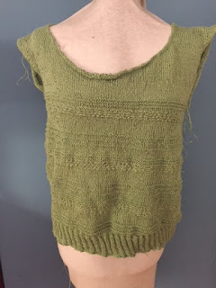 The Summer Fjord linen tee is being bound off during the show. It is knit from Fibra Natura 100% linen yarn.