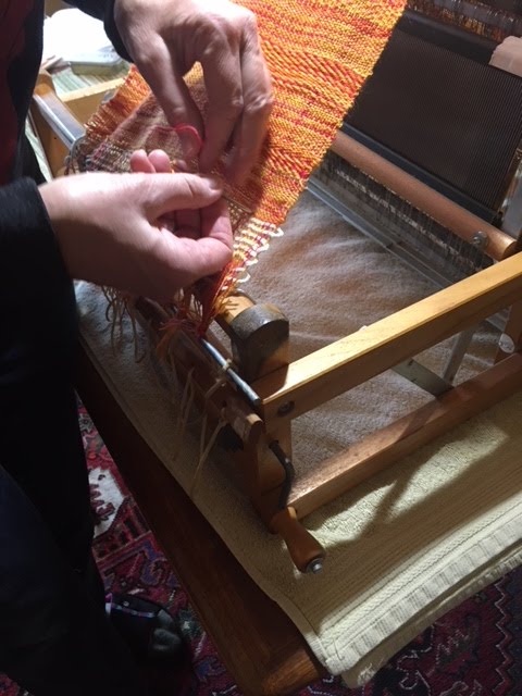 We double checked often for threading errors or crossed threads. Once we were done threading, we tied on, wound onto the back beam and then tied the ends onto the front apron rod. Then we were ready to weave (although we should have done some hemstitching first). Notice the way the warp thread is placed into the shed. It can be done like this convex shape or in a diagonal line up toward the harnesses. This allows room for the yarn to curve around the warp threads and helps prevent the drawing in that can occur on the edges.
