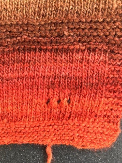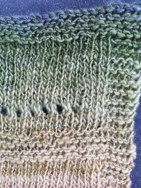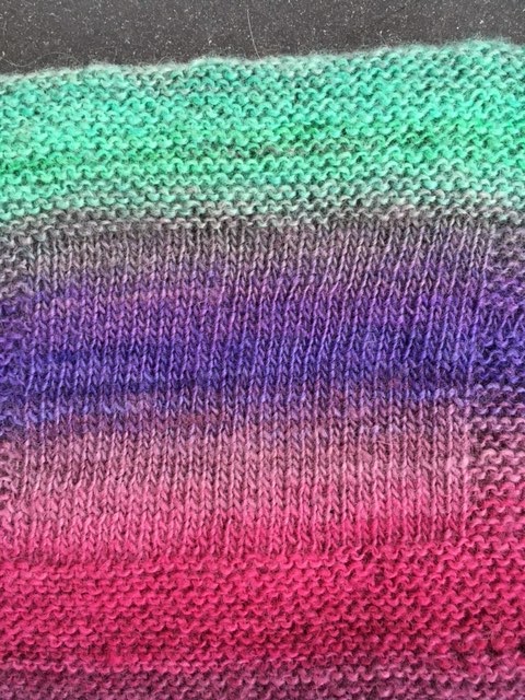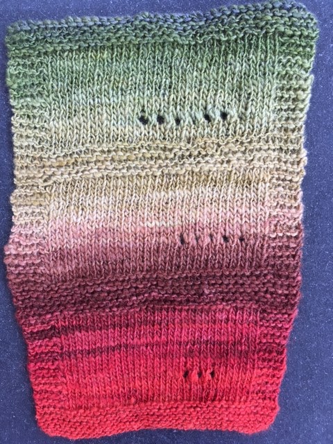 Size 3 needles, garter stitch border and stockinette center. A little energy evident as buckling in unwashed swatch. After washing, no evident biasing or buckling. Light fabric with good stitch definition. Note how colors of the swatch are clear and not muddied or blended by plying.