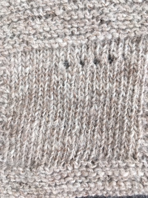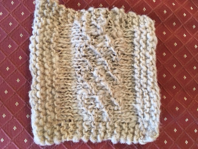 Aged CVM singles swatch: Size 10 needles. Fluffy and light. No biasing, but a little buckling before washing. Used stockinette and basketweave pattern (alternating k2P2 for two rows then P2K2 for two rows). Stitch definition not clear. Unevenness of yarn not really evident in stockinette, very evident in garter stitch.