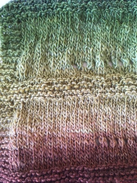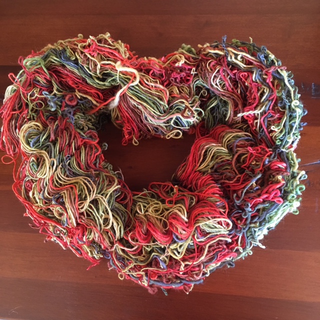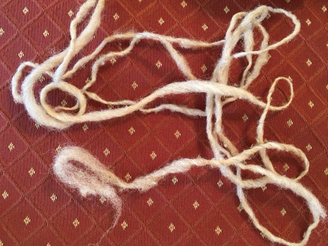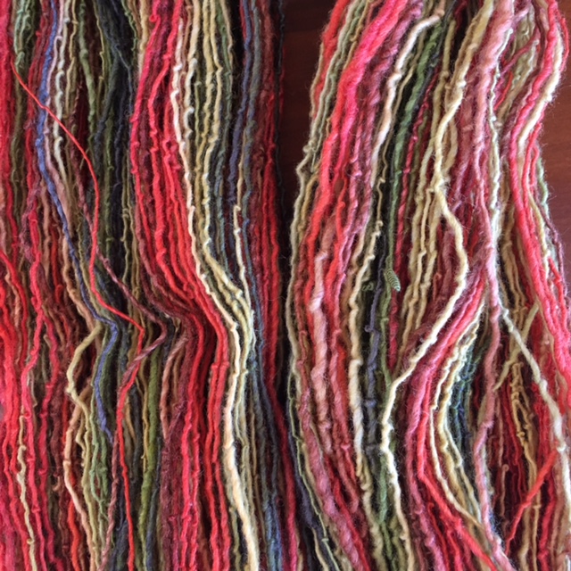 Aged CVM singles. These woolen-style singles were wound from the wheel to a center pull ball in early 2016. The yarn is a worsted to aran weight, not consistent in its grist, and spun woolen on the Ricci Indian Head Spinner. This wheel has tremendous draw in and I am still getting accustomed to it to the yarn was a very low twist singles. The fiber was a carded preparation of California Variegated Mutant (CVM). The yarn was not washed prior to using and since it was in a ball, I never saw how it would hang in a hank.