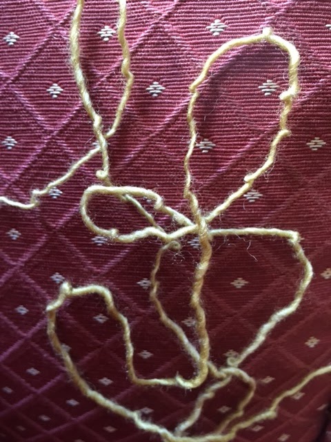Well-aged singles. This was purposely spun as a low-twist worsted singles, using the slowest whorl on my wheel. The fiber was Blue-Faced Leicester from Wool Gatherings' fiber club (2014). The yarn was about sport weight. When wound from the wheel into a skein it was kinky, but after washing it wasn't highly energized. There were no bends or kinks left in yarn. It had been washed a little harshly, with agitation in hot water and soap, to slightly full the yarn. This yarn had been wound into a center-pull ball about two years ago. Re-soaking a bit of the yarn didn't result in a more twisty or energized yarn.